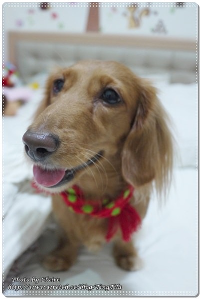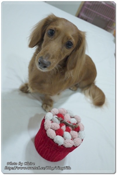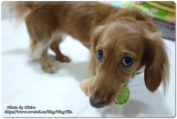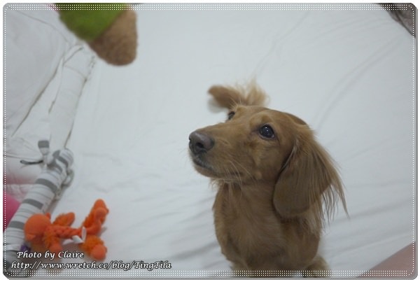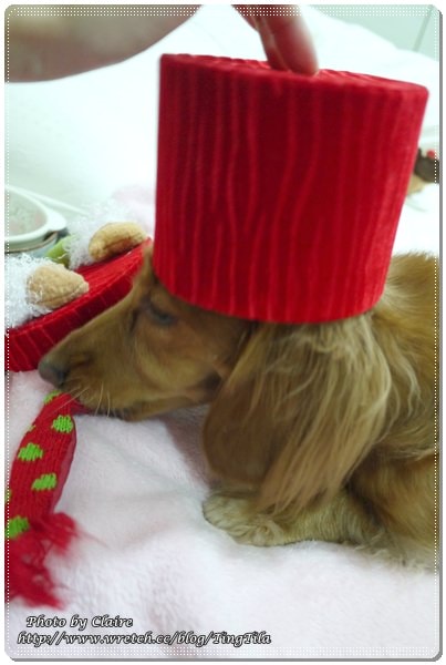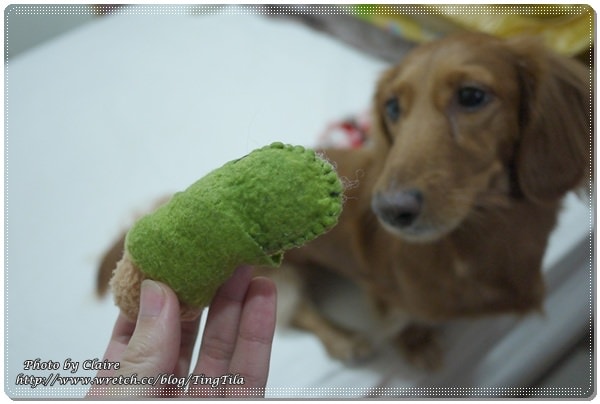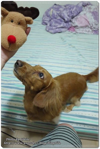 當我ㄧ把置物盒放在床上,馬上….TILA妞就把麋鹿頭連同蓋子一起咬走 囧